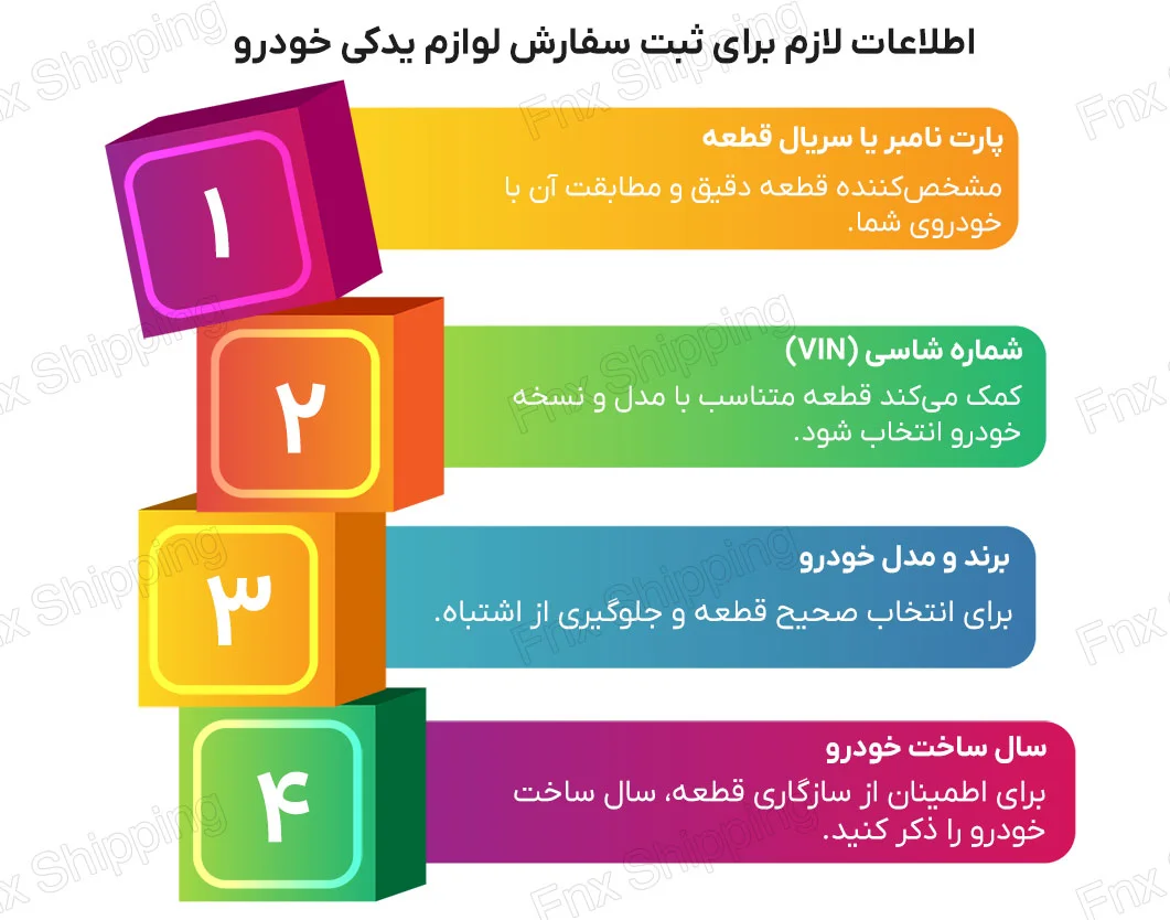 مهم نیست که شما چه قطعه خودروی خارجی از چه برندی نیاز دارید، شما باید در زمان ثبت سفارش و تماس با کارشناسان گروه تجاری ققنوس حتما موارد زیر را ارائه نمایید تا همکاران ما بتوانند موجودی قطعه یدکی مورد نیاز شما را بررسی نمایند و نهایتا اعلام قیمت کنند:
